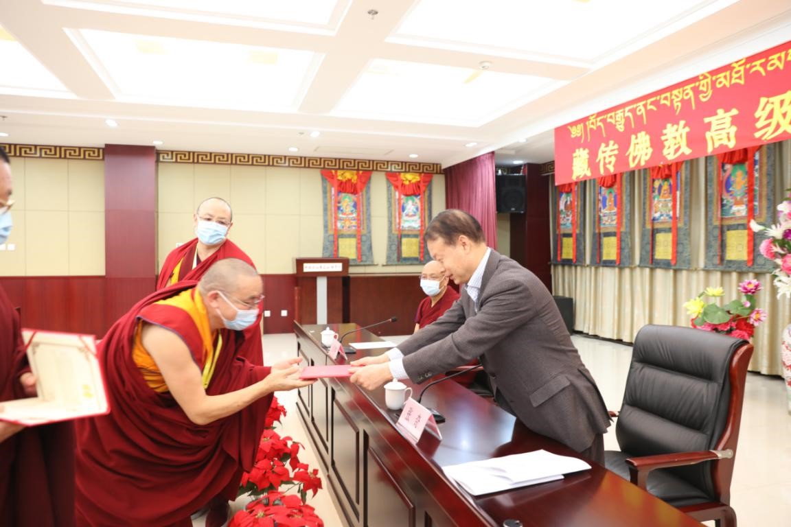 藏传佛教学衔工作指导委员会秘书长、高级佛学院党组书记、常务副院长张奇向新聘请委员颁发聘书