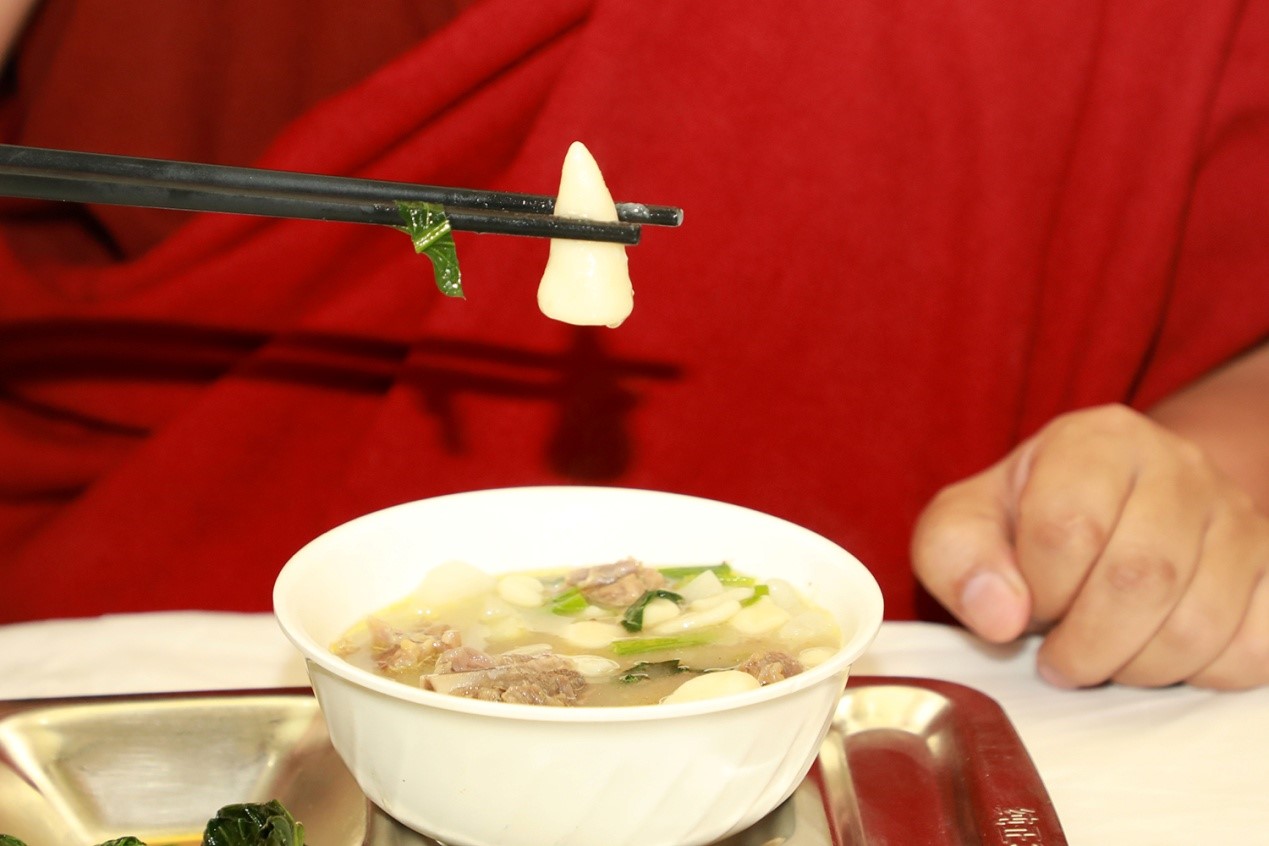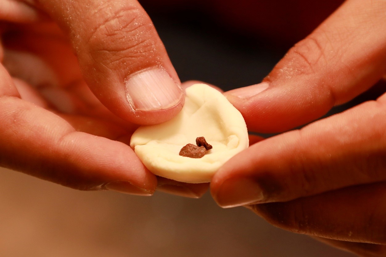 “古突”是藏式传统面疙瘩汤,是藏历新年必不可少的“年夜饭”。学员们按照民俗传统做法,把羊毛、辣椒、蕨麻、盐、石头等包进面疙瘩里,吃到羊毛寓意“性格温柔”、吃到辣椒代表“嘴不饶人”......图为2月27日(藏历十二月二十九日),学员将蕨麻包进面疙瘩里
