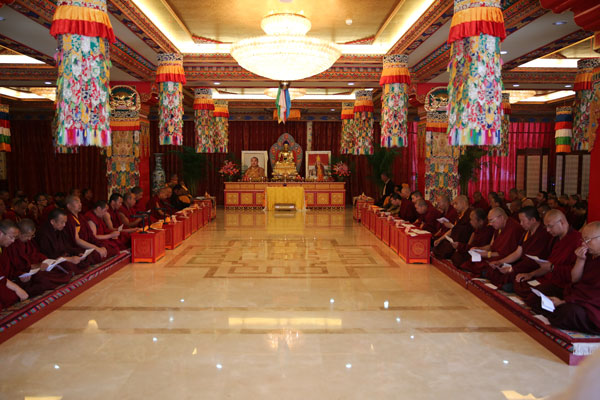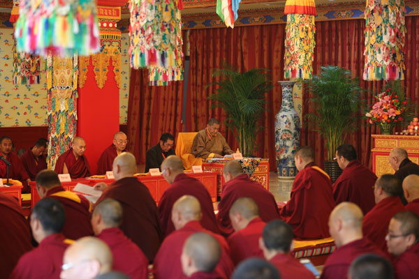 上午9时,高级佛学院阳光楼大厅内庄严肃穆、佛灯长明,珠康·土登克珠活佛、新杂·单增曲扎活佛等向释迦牟尼像顶礼,并敬献哈达、供灯、藏香等供品,随后带领参加此次学衔授予活动的百余位藏传佛教界僧人共诵《皈依发心文》、《十一世班禅大师长寿祈请文》、《普贤行愿品》、《莲师遗教经》、《衍教经》、《祈福和回向》等经文,祈祷世界和平、国家昌盛、民族团结、众生康乐,祈祷藏传佛教第十二届高级学衔暨第四届中级学衔授予活动圆满顺利。